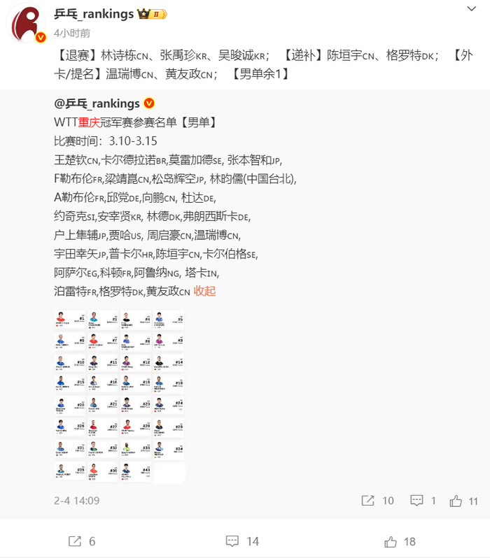 北京时间3月4日,WTT重庆冠军赛外卡名单已经确定,黄友政、温瑞博两位国乒小将入选,重庆冠军赛将在3月10日开打。